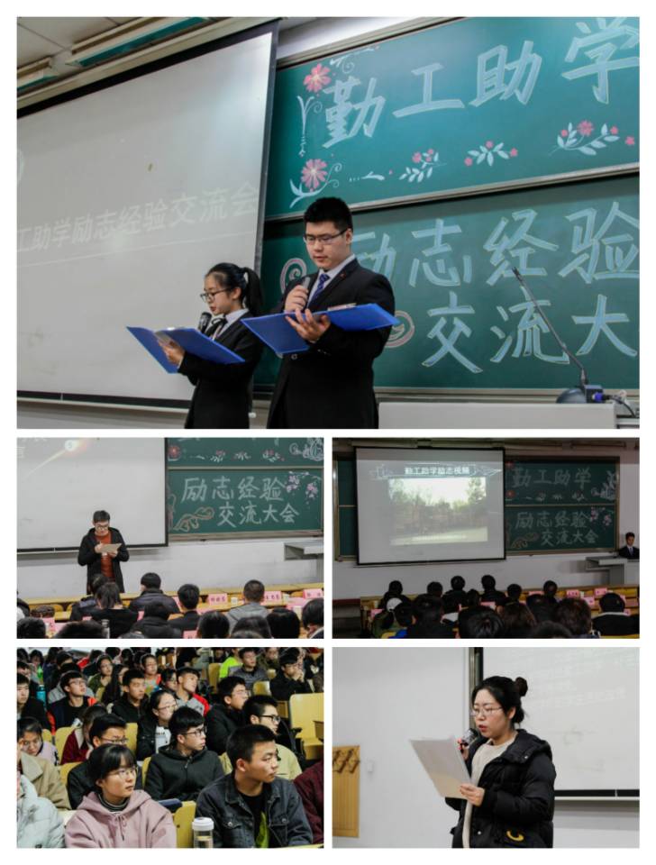 勤工部于2018年11月27日在教学楼08102召开了勤工助学励志经验交流大会。到场嘉宾有学生科孟姣老师、王思豪老师、郭浩老师以及各学院勤工部部长和学生代表。