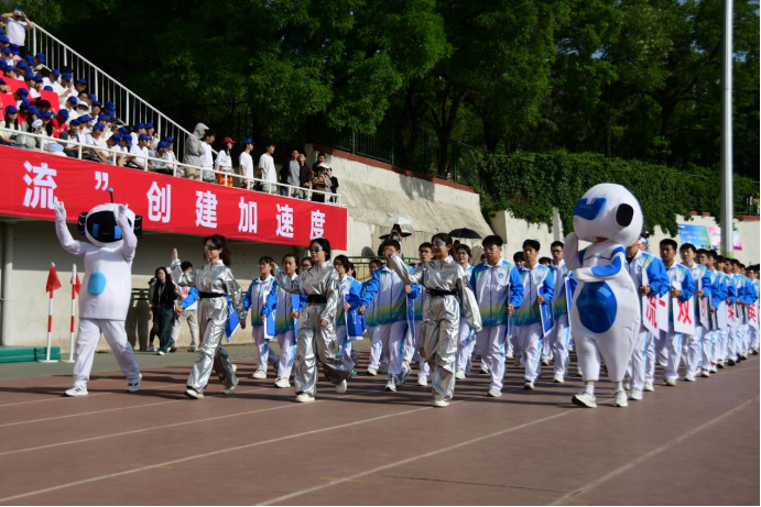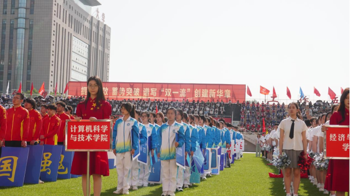 的学子们身着统一服装迈着整齐步伐踏入运动场,身着科技感服装的舞蹈者和两个机器人玩偶热情地向主席台挥手。紧接着,方阵成员迅速变换队形,组成巨大的键盘造型。键盘上跳动的代码编译出“工程精英、时代栋梁、共创双一流”的口号。之后方阵成员默契配合,将“键盘” 迅速翻转,“云网智联创一流,赛场拼搏展雄风” 的标语赫然呈现,彰显出学院在专业领域不断创新以及在运动场上奋勇争先的精神风貌。