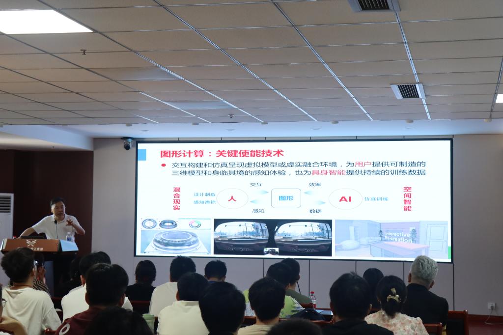 鲍教授以“三维空间的智能重建与绘制”为题展开报告。开篇立足图形计算的内涵与现状趋势,剖析该领域当前面临的技术挑战,明确提出复杂动态场景物的紧致可微表达及高效高精智能建模仿真两大核心命题。继而转向现实景物的可微视觉三维重建方向,系统阐述团队在多视图三维重建、神经隐式三维重建与绘制以及智能生成式三维重建领域取得的研究进展。针对虚拟场景高效逼真神经绘制难题,报告解析传统光照模型与GPU/神经图形处理器(NGPU)图形绘制原理,重点推介团队首创的以对象和光源为中心的物理神经图形绘制方法。最后从软硬件系统维度详述神经图形绘制流水线构建、神经图形芯片架构设计及混合现实软件平台开发成果。