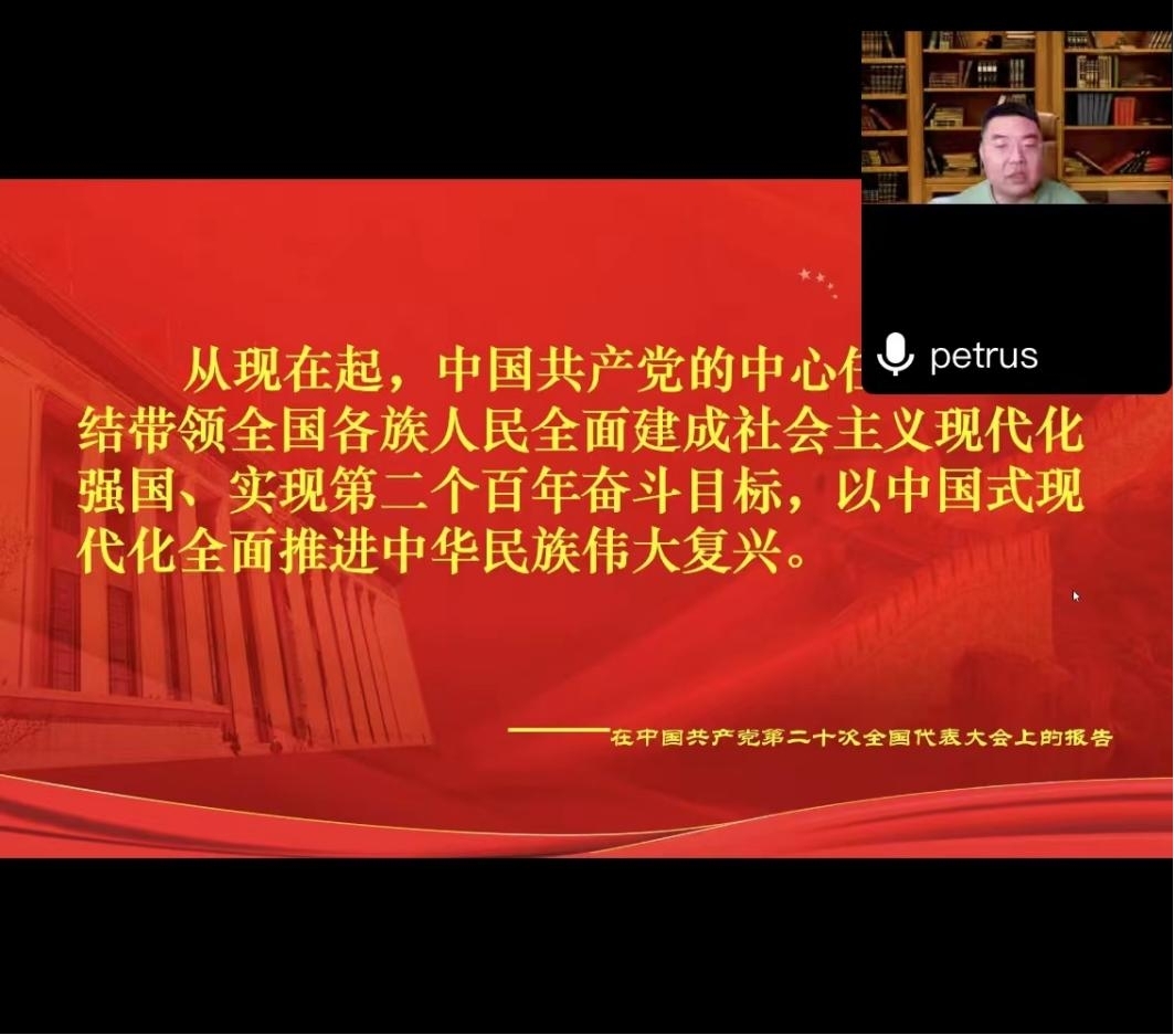 为引领全院师生学习好、宣传好、贯彻好党的二十大精神,2022年12月29日下午,海角社区 邀请党的二十大精神校内宣讲员、马克思主义学院杜刚副院长为海角社区 师生党员和群众代表进行线上主题宣讲