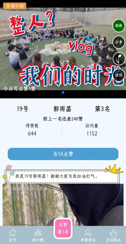 本次活动采用以宿舍或个人为单位拍摄防疫主题短视频的方式通过抖音平台和投票平台发布进行集赞和投票,最后将宿舍抖音短视频的所得的点赞和转发量以及在投票平台所得票折算进行评比。在踊跃的报名之后,各队伍积极地投入短视频的拍摄中,通过歌颂英雄,弘扬中华传统文化等主题,以唱歌跳舞,模仿秀等形式将自己、宿舍最好的一面展示给大家。经过审核加最后的投票环节后,共有8名同学获得我们的奖品。